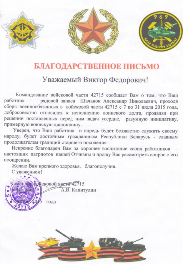 Командир войсковой части 42715 полковник А.В. Капитулин сообщил руководству организации, что работник УКПП «Коммунальник» - рядовой запаса Шачанок Александр Николаевич, проходя сборы военнообязанных с 7 по 31 июля 2015 года добросовестно относился к исполнению воинского долга, проявлял при решении поставленных перед ним задач усердие, разумную инициативу, примерную воинскую дисциплину.