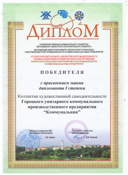 Коллектив художественной самодеятельности УКПП «Коммунальник» представляли 11 человек: Константин Сойкин, Ирина Каратай, Ирина Прокопова, Николай Куприянов, Денис Костиков, Алеся Матюшевская, Людмила Батуревич, Елена Кузнецова, Лариса Разгородина, Тамара Подберезкая под руководством председателя профкома Владимира Шупилова.