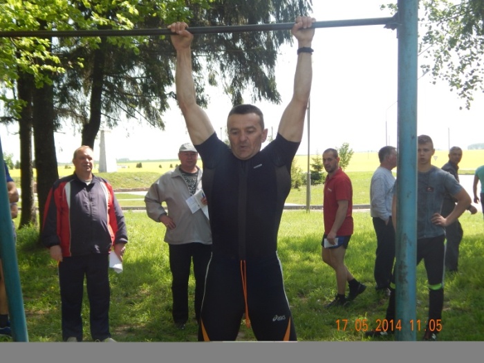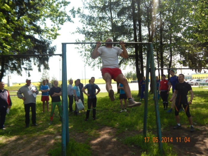 Андрей Бочков на перекладине, не подводит напарника по команде и подтягивается 21 раз, занимает 2-е место в соревнованиях.