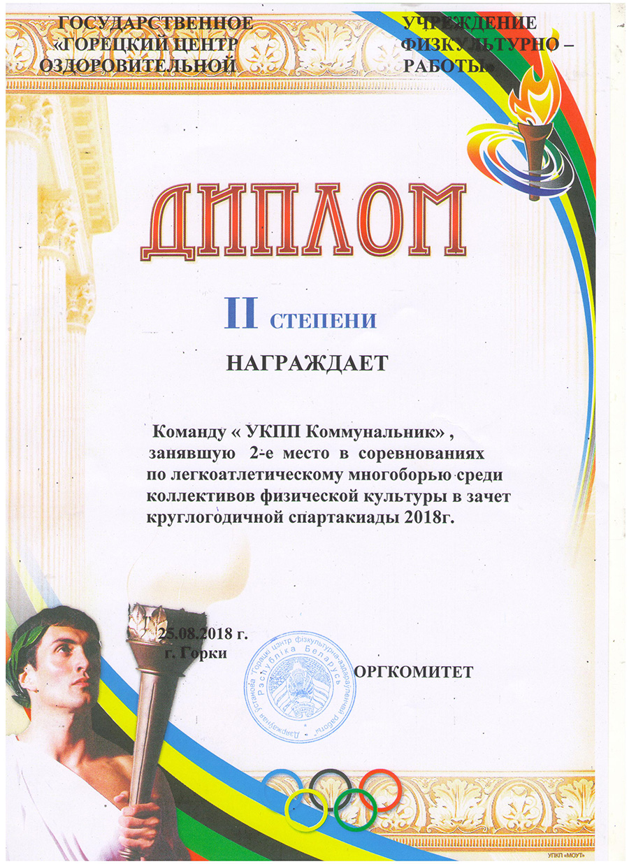 Наша команда в составе: Олеси Михалушкиной, Надежды Жариковой, Дарьи Пажарицкой, Андрея Сороко, Дениса Напреенко, Дмитрия Горбунова по результатам набранных очков заняла почетное II-е место в соревнованиях по легкоатлетическому многоборью среди городских коллективов физической культуры.