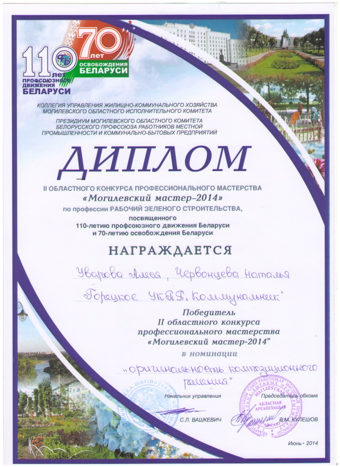 6 июня 2014 года в г.Могилёве в системе жилищно-коммунального хозяйства прошёл II-й областной конкурс профессионального мастерства  «Могилёвский мастер – 2014» по профессии – рабочий зелёного строительства, посвящённого 110-летию профсоюзного движения Беларуси и 70-летию освобождения Беларуси. Организаторами конкурса выступили управление ЖКХ Могилёвского облисполкома, Могилёвский областной комитет Белорусского профсоюза работников местной промышленности и коммунально-бытовых предприятий и Могилёвское городское унитарное коммунальное предприятие «Управление коммунальных предприятий» Могилёвского облисполкома.
