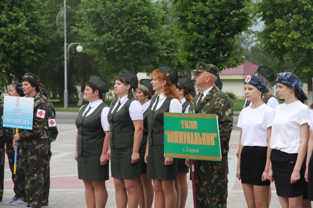 Команды предприятий и организаций города заняли исходную позицию для проведения строевого смотра. Четким шагом перед строгим жюри прошли дружины. Всего – 13 команд. Жюри оценивало этот конкурс по «чистоте» парадного шага и исполнения строевой песни. В результате третье место досталось команде девчат УКПП «Коммунальник»  в составе Елены Спасиковой, Натальи Северцевой, Елены Кузнецовой, Галины Хаировой, Оксаны Куреленок, Елены Азаренковой, Елены Караульной, Татьяны Васильевой, Оксаны Мартыненко и командира Дмитрия Мартыненко.