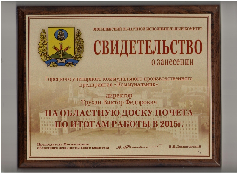 Хорошая весть пришла на предприятие. Решением Могилевского облисполкома трудовой коллектив Горецкого УКПП «Коммунальник» по итогам работы за 2015 год занесен на областную Доску почета.